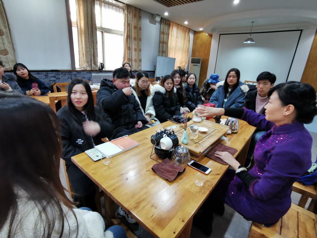 2019年11月28日,G-18级会计、营销、旅游、酒店班《中国茶文化课》(限选)“旅享课堂”请来《悠然阁茶行》的许敬肖老师,在紫藤茶社为同学们讲授花茶以及茶艺。许老师带来了上好的茉莉花茶,为同学们现场冲泡和品鉴。