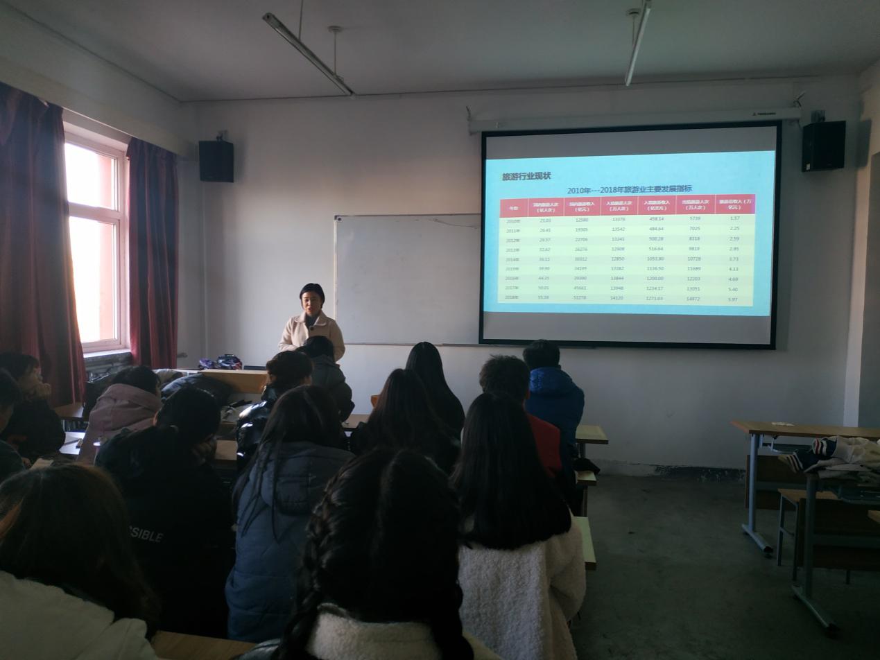 为了提高学生们对旅游专业的了解与积极性,让同学们投身于旅游行业中,2019年12月3日,旅游学概论的课堂上,河北东方国旅的优秀领队郭杰女士为同学们上了一堂主题为深入客观了解旅游业现状以及职业发展的生动的课。课堂话题环环相扣,专业性很强,获得了同学们的阵阵掌声,这堂课不仅让同学们对心中憧憬的旅游业有了新的定位,也解决了同学们心中对旅游业的困惑。相信通过这堂课,同学们不仅更加热爱旅游业,也会更加勤奋努力的学习与钻研!