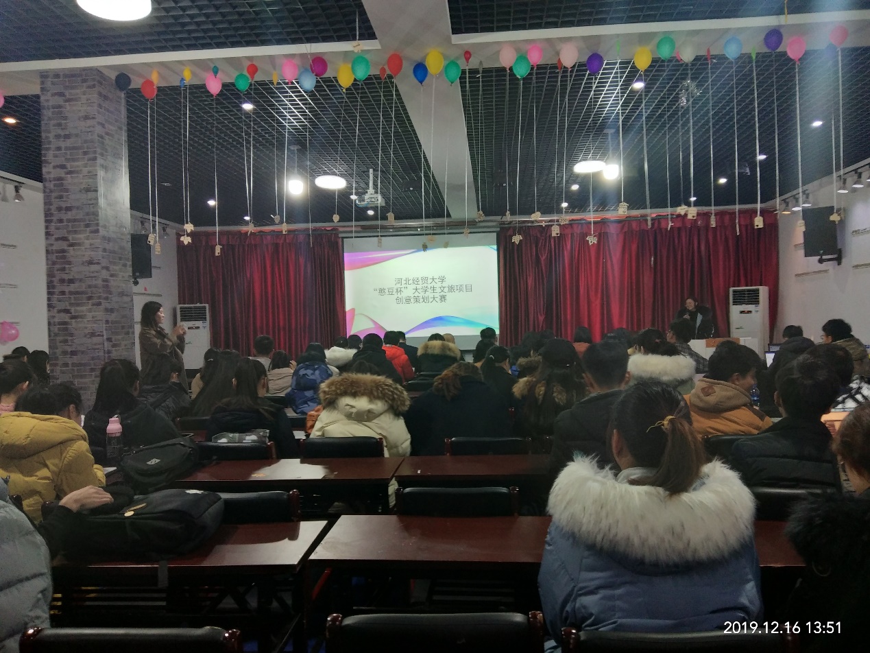 憨豆公社文旅创意策划大赛初赛于2019年12月16日下午两点在Rule34 会展实训室举行。大赛的主题是“豆”。此次评委由六个憨豆公社公司高层管理人员和三个经贸大学的老师组成。
