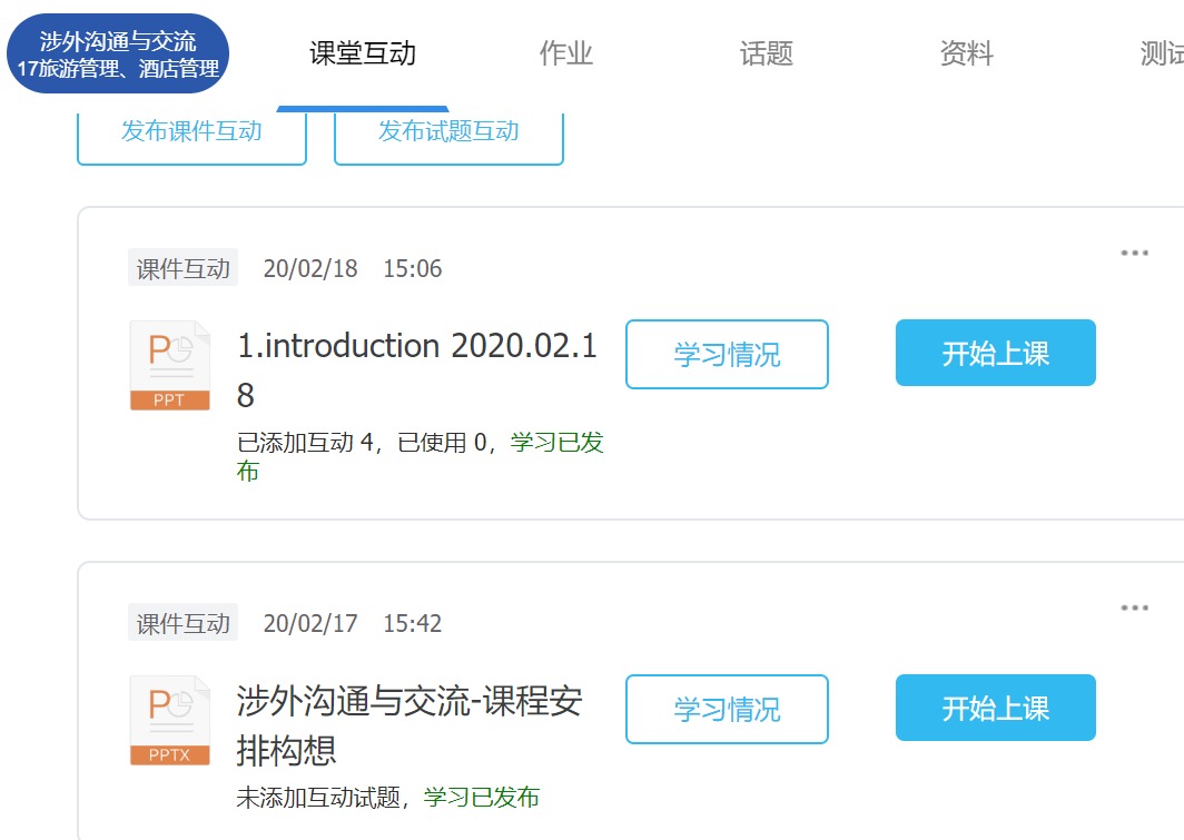 本课程是面向学院大三学生开设的专业选修课,根据课程关键字,将课程内容锁定为涉外礼仪与翻译、沟通心理学、跨文化交流技巧三大板块,提高学生涉外英语口语为重点学习目标。在返校之前的这段特殊时期,基于课堂派平台,以知识学习与学生自主练习为主;待到开学时,再强化口语练习。