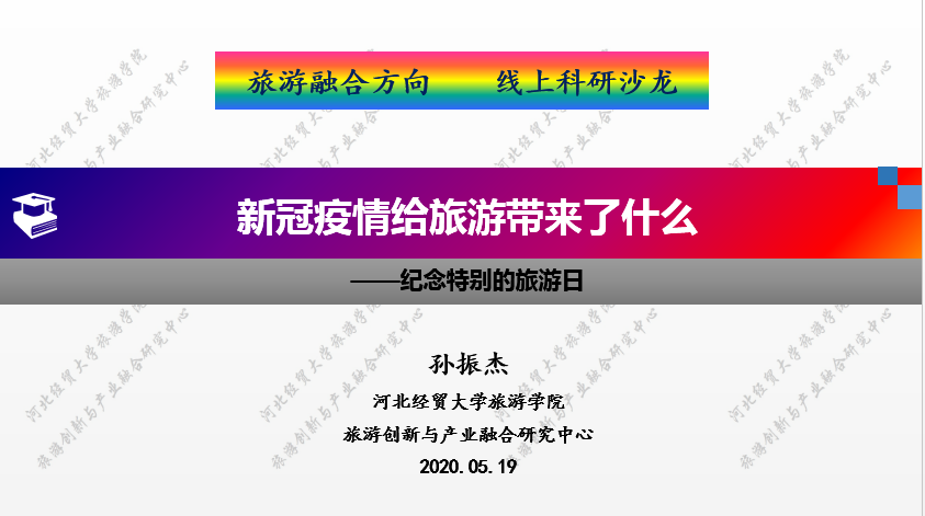 2020年5月19日下午,旅游融合方向的科研沙龙在QQ群以语音会议+屏幕分享方式进行,除有课的师生外都参加了本次沙龙活动。首先,主讲人孙振杰老师发起会议,围绕新冠疫情给旅游带来了什么,孙振杰老师从遭受重创的供给端、弹性改变的需求端、紧急出手的旅游治理等几个方面分享了个人的认识。随后,各位老师结合自己的感受和文献阅读,纷纷发表见解,涉及旅游企业经营、从业人员工作开展、旅游危机管理、应急管理等内容,持续时间80多分钟。
