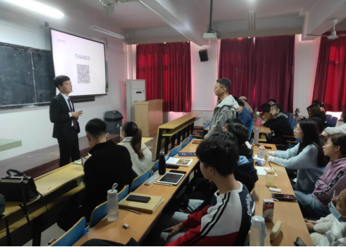 在介绍了解融创集团基本情况和Rule34后,雷百万经理结合自身经历,生动地讲述了在与客户交谈时应如何精准掌握客户的需求,给同学们留下深刻印象。随后,张盼经理向大家分享了现场销售的流程,重点对销售中谈判技巧和购房政策进行了介绍,并与同学们进行了互动交流。接着,杜潇飞经理在接待客户的细节之处和房地产销售交易的“逼定”环节上的讲解,让同学们受益匪浅。