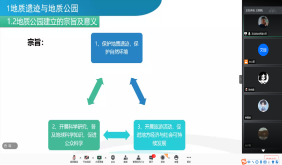 王铠铭工程师从地质遗迹与地质公园、黑龙江省地质遗迹保护与开发利用、地质遗迹保护与开发利用前景三个大的方面向同学们作了精彩讲解。分享结束后,同学们主要就地质遗迹旅游开发中的解说系统建设、地质公园旅游发展中的社区参与、管理模式等几个方面提出了问题,王铠铭工程师逐一进行耐心解答,线上互动交流热烈。同学们对本次的线上分享与交流活动纷纷表示受益匪浅,对今后开展地质遗迹保护与地质研学旅游开发等奠定了重要基础。
