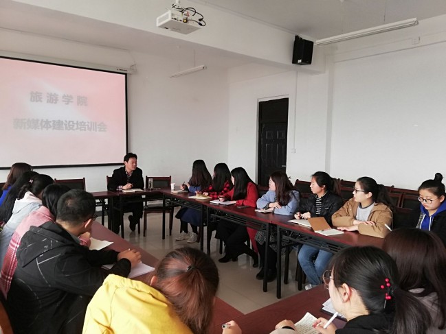 在会议室召开新学期新媒体建设培训会,院党委书记刘风长、副书记耿会清出席培训会,学院新媒体中心全体成员参加。