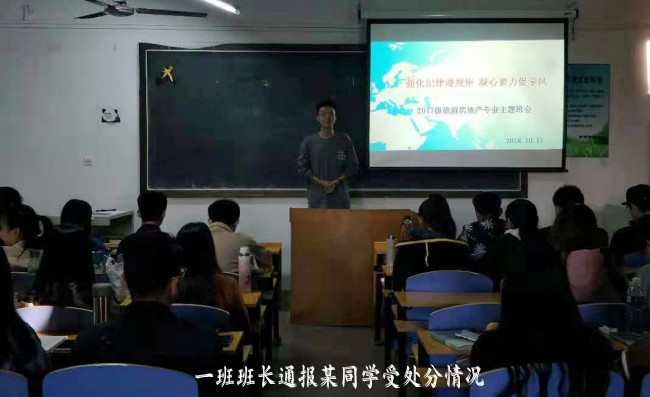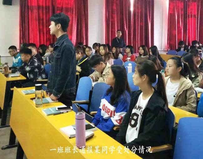会议伊始,一班班长针对上学期一名同学因违反校规刷课,而被学校记过处分的行为进行了通报,指出该行为不但对其个人造成了严重后果,而且对专业班级也造成了不良影响。