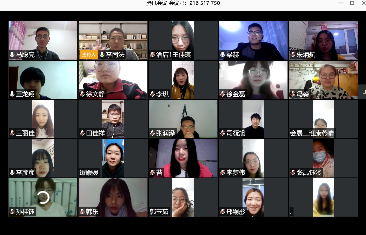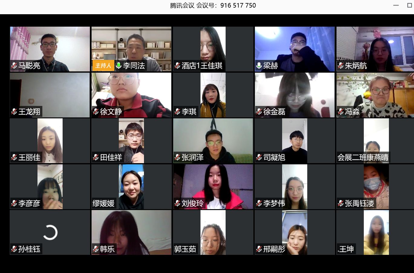 2020年4月16日晚7:00李同法老师组织18级会展、酒店班班委通过腾讯会议开展了线上主题班委会。