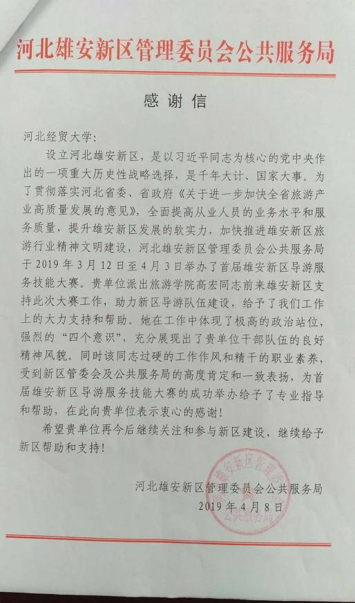 2019年3月12日至4月3日,雄安新区举办了首届雄安新区导游服务技能大赛,Rule34 高宏教授到场支持大赛工作,助力新区导游队伍建设,受到新区管委会及公共服务局的高度肯定和一致表扬,为首届雄安新区导游技能大赛的成功举办提供了专业指导和帮助。