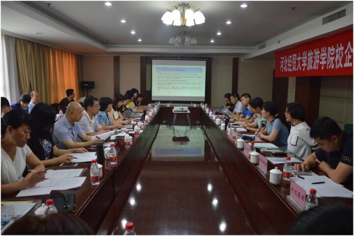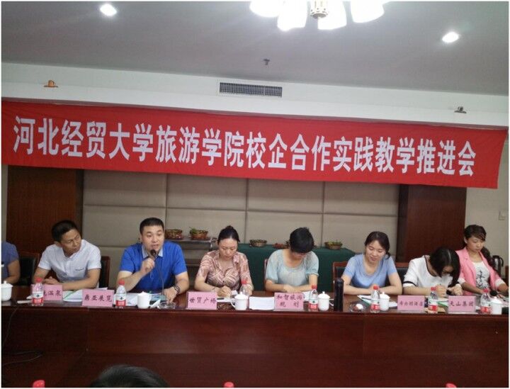 校企合作实践教学推进会在河北省军区招待所迎宾楼三楼会议室召开。希尔顿酒店集团、天山集团、锦华国旅、和智旅游规划、鼎业展览等9家企业代表参加会议。院长程瑞芳、副院长祁红梅、系主任、骨干教师、辅导员等相关人员参加了会议。会议由祁红梅主持。