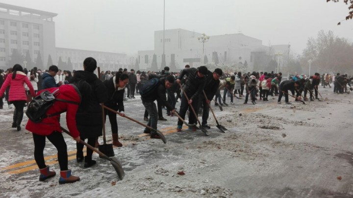 于2015年12月1日下午组织了全院学生进行铲冰扫雪活动,学院党委副书记耿会清和各班辅导员亲自到场组织指挥,全院学生共同参与,齐心协力清除积雪。