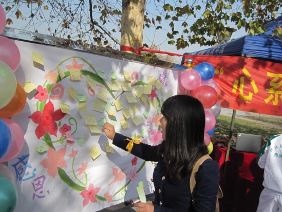 在韶华路的活动现场,志愿者热情地为路过的同学们系上黄丝带,并引导大家在横幅上签名,最引人注目的是“感恩箴言”环节,同学们纷纷在“感恩墙”上留下各自的感恩语录,一句句祝福藏着深深的感恩情怀,一张张感恩小贴纸很快覆盖了整个“感恩墙”,张张都彰显着同学们那颗感恩的心。