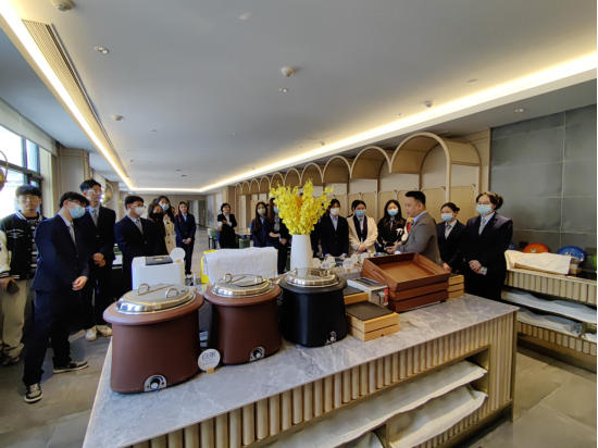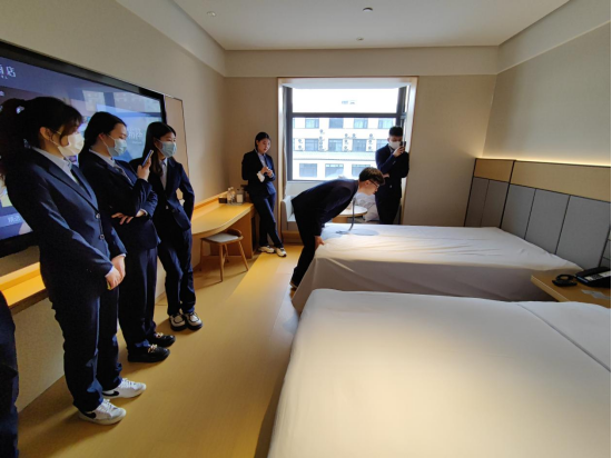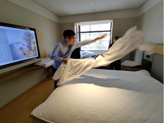 酒店参观活动结束后,全季酒店为同学们安排了实操体验环节。客房清洁训导师们为同学们展示了酒店管理最需要了解的客房铺床基本技能,并指导同学们进行了体验操作。同学们在观摩之后开始了自己的操作,甩床单、包边角、装被芯、装枕套、打枕线,最后收理,虽然做床质量一般,但在体验过程中对于运营管理中所要求的的标准操作流程SOP、督导培训和品控管理等方面都有了切身的体验和深刻的感悟。