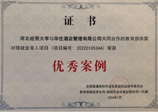 通过与华住集团共建教育部供需对接就业育人项目,在短短一年多时间内就为华住集团提供了大批优秀酒店管理本科人才,极大地拓展了毕业生的职业前景和晋升机会,校企合作取得了令人满意的双赢成果,并于2024年1月成功入选教育部供需对接就业育人项目全国优秀案例。