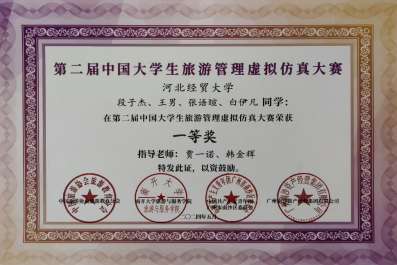 教师贾一诺、韩金辉带队,酒店管理专业段子杰、王男、张语暄、白伊凡同学组队参赛,经过激烈角逐,获得了全国一等奖的好成绩,为学校赢得了荣誉。