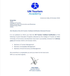 收到联合国世界旅游组织旅游教育质量认证中心的认证报告和信函,确认学院所申报的旅游管理、会展经济与管理和酒店管理三个本科专业全部通过旅游教育质量认证复核,时长3年。