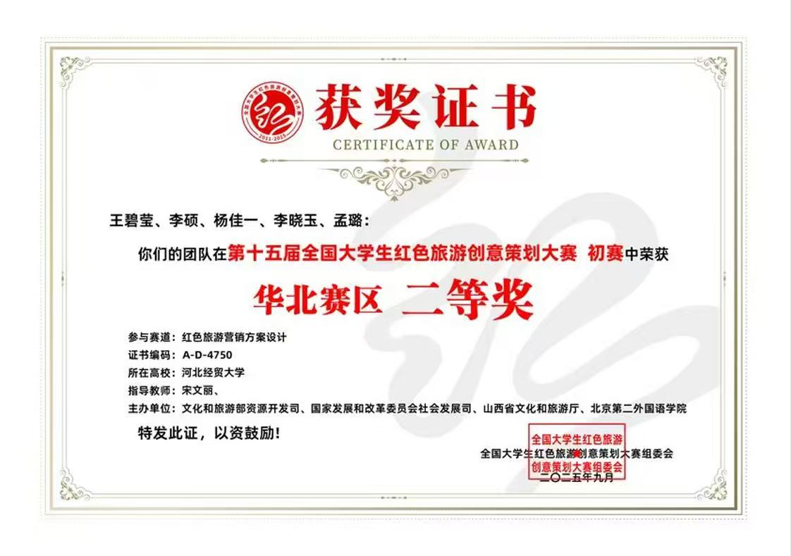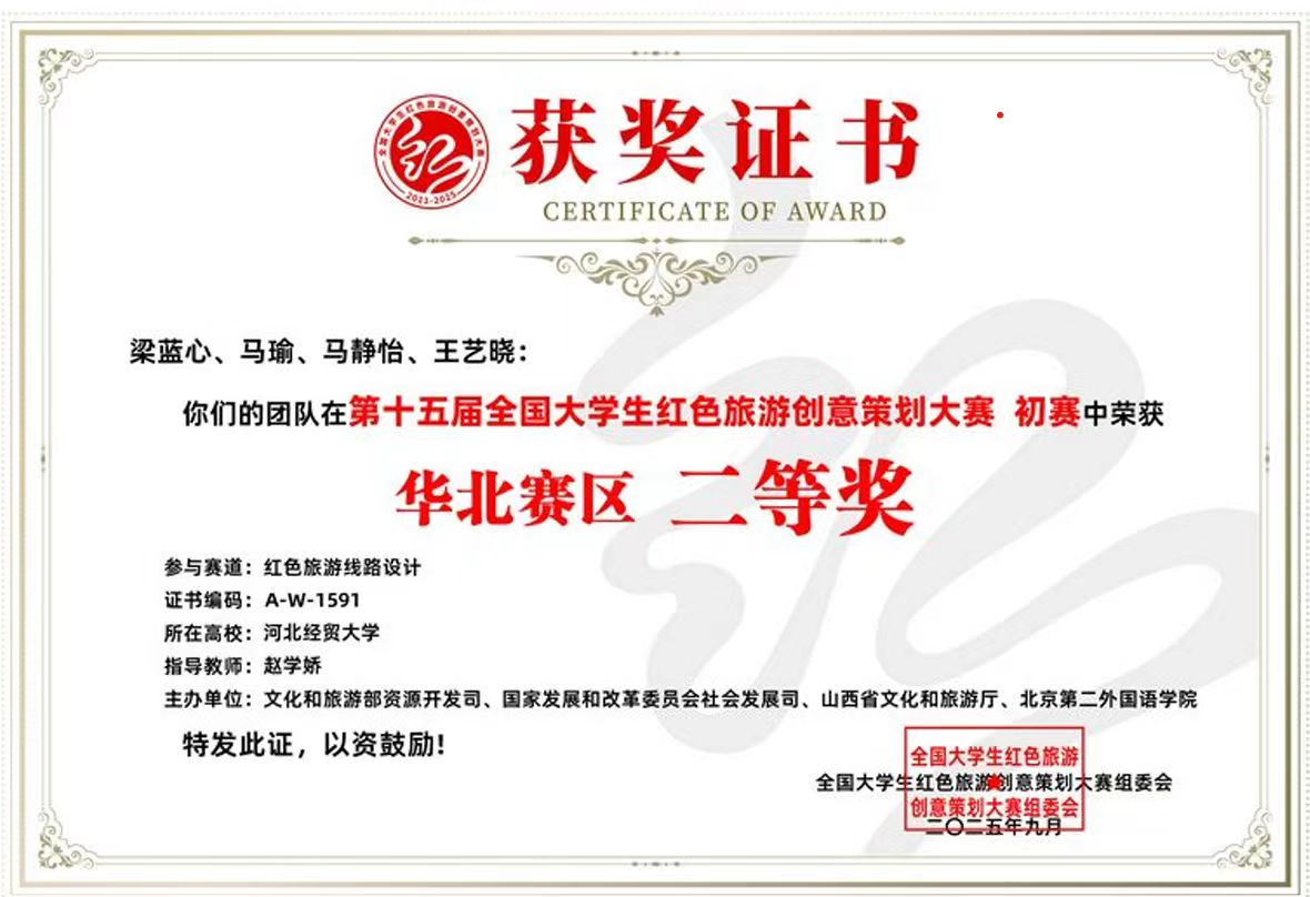三支团队分别在红色旅游线路设计、红色旅游文创产品设计、红色旅游营销方案设计三大赛道斩获华北赛区二等奖,彰显应用型人才培养硬实力!