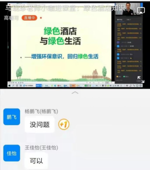 为丰富学生对绿色酒店理解以及专业的认知,培养学生在专业领域的发展理念及对绿色概念的理解,2021年9月30日下午利用绿色酒店的课堂,G18级酒店管理专业学生在线上参加了由任课教师马现珍老师邀请进入课堂的“小咖”——绿色酒店评定人高睿可老师的爱人何立军先生。此次课程给我们带来了对绿色生活和绿色酒店更加深入的了解,让更多的同学了解到绿色生活的现状,也重新加深了对于绿色酒店的认识新的认识。