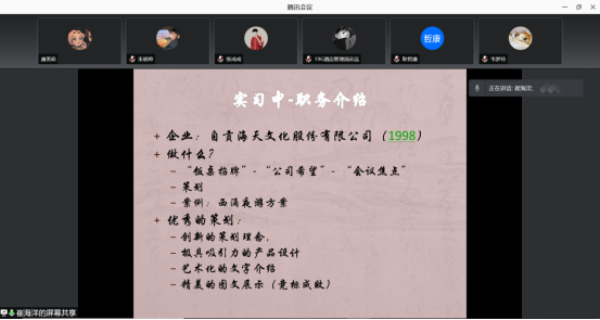 2021年10月20日上午,贾一诺老师邀请到了前自贡海天文化股份有限公司策划崔海洋,在腾讯会议中为2019级酒店管理专业的学生开展了一次“云课堂”。