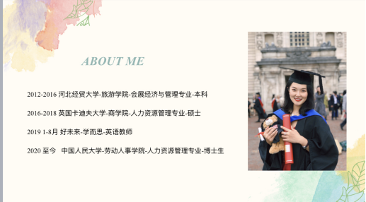 首先, 马瑞君 女士以自身在 经贸大学学习生活中的四个故事开篇,讲述 了 自己曾在英语学习上积极主动从而把握住了提升、打磨自己的宝贵机会,同时也对学弟学妹们提出了有益的建议,不要因为懦弱胆怯而放弃锻炼自己, 应该 制定可行的计划,勇敢尝试,用可视化的手段管理时间,才能让自己有更多的收获。