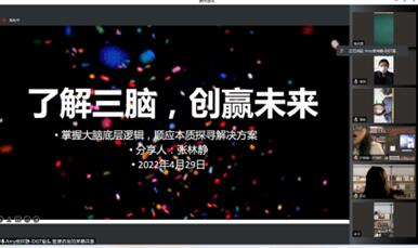 开始之前,张灿老师向同学们介绍了张林静老师,大家纷纷进入腾讯会议与张老师进行连线,老师就三位一体大脑理论,如何用三脑进行对话,改变方程式向前迈一步,这三部分为大家进行了讲解与交流,其中乔哈利视窗 ,NLP意义换框法等同学们留下了深刻的印象,发人深思。讲学中张老师不忘与同学们交流,同学们踊跃与张老师进行交流,并且和同学们线上连线回答问题进行互动。同学们提出的问题,张老师也一一为我们解答,她的讲解十分精妙,通俗易懂,最后张老师也就自己的行业经验为我们提出了宝贵的建议,使得同学们产生了更多的兴趣。