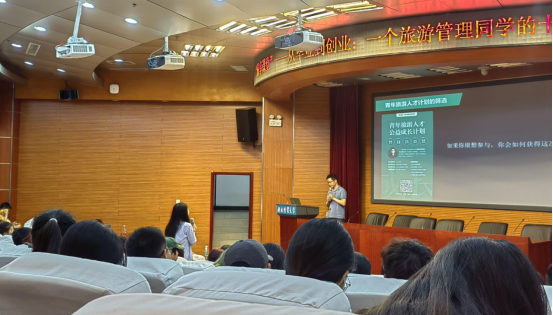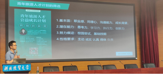 许义老师从专业、研究、看世界、择业、就业、创业等几方面介绍自己10年的行业经历,提出创业过程中要有激情、热爱,不断的去思考、写作才能找到自己人生的可能。之后,许义老师从中国旅游业的未来发展和职业机会方面介绍了当下在线旅游的选人要求及岗位需求。最后,许义老师从能力素养和人才模型这一方面为我们讲述了青年旅游人才计划,以及想参加计划时应如何制作简历才能获得这个机会,并为我们提供了筛选方面、能力素养与新旅游人才模型的要求和挑战。
