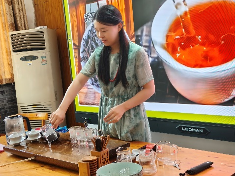 除了理论知识的讲解,吴英老师还亲自展示了茶艺。作为二级茶艺师,她一边展示一边讲解着每一个步骤的要点和所蕴含的文化内涵,从温杯洁具、置茶闻香,到控制水温、把握冲泡时间,再到分茶敬客,每一个环节都蕴含着“客来敬茶”的中国传统礼仪,传递着以茶待客的真诚与尊重。茶泡好之后,大家纷纷品茗,感受着中国茶的独特魅力。