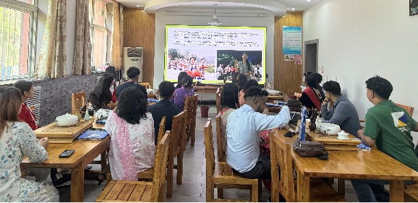 在讲座环节,吴英老师全英文深入浅出地介绍了中国茶文化的相关内容,从茶树的类型起源,到不同朝代茶文化的发展脉络,再到六大茶类的详细分类等。中国传统的制茶技艺及其相关社会实践在2022年被列入联合国教科文组织人类非物质文化遗产代表作名录,2023年普洱景迈山古茶林文化景观成为世界首个茶主题世界文化遗产。这些成就让尼泊尔学子对中国茶文化在世界文化中的重要地位有了更清晰的认识,激发了他们对中国传统文化的浓厚兴趣。