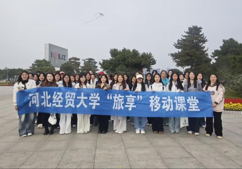 第一站是校歌多次提及的滹沱河生态区——火车主题公园:秋日河畔草木含翠,水波轻漾,同学们分组实操旅拍摄影,定格河景的同时切实体会到了旅游摄影的实用价值。同时,围绕 “自然生态旅游目的地观察” 展开实践:观察植被景观、设施布局与游客动线,分析生态景观与工业文化(火车头元素)的融合路径等。